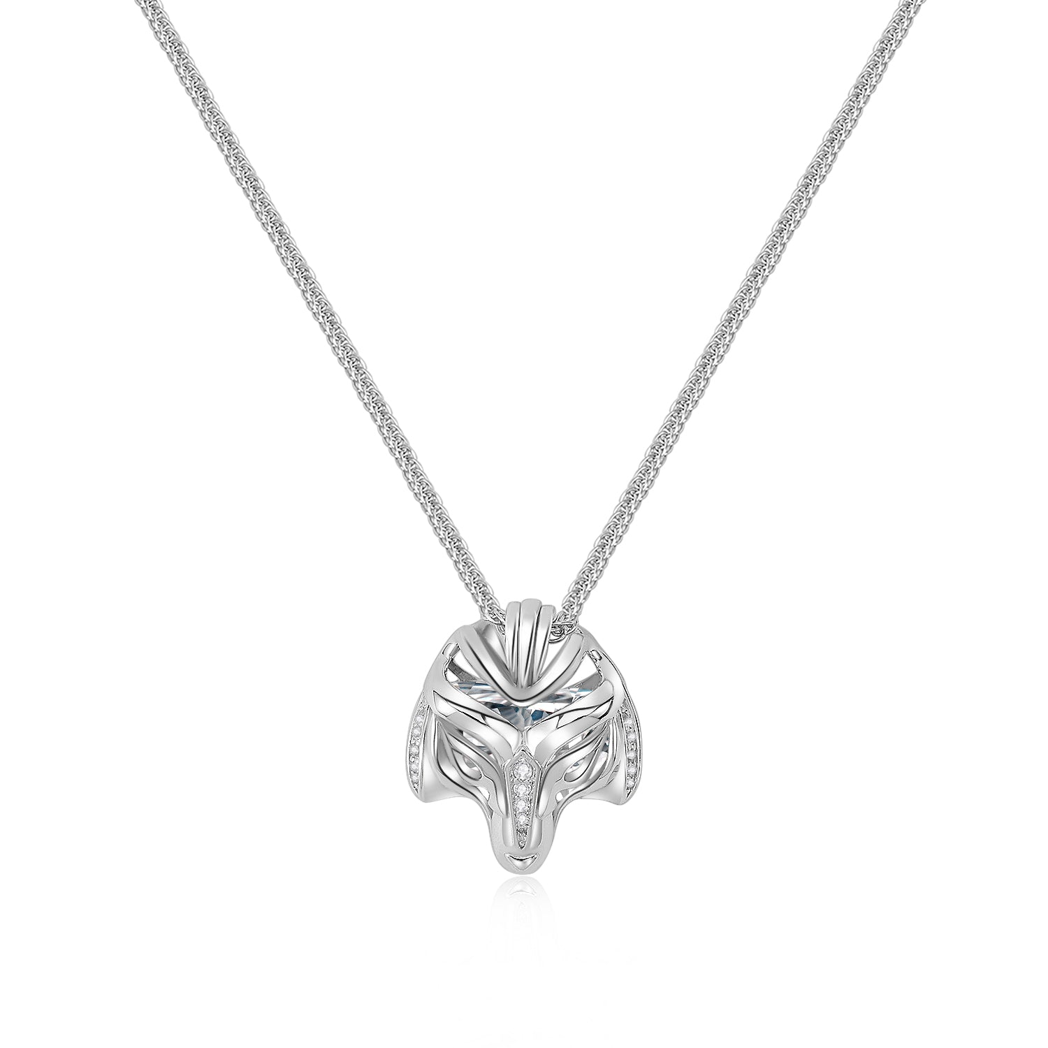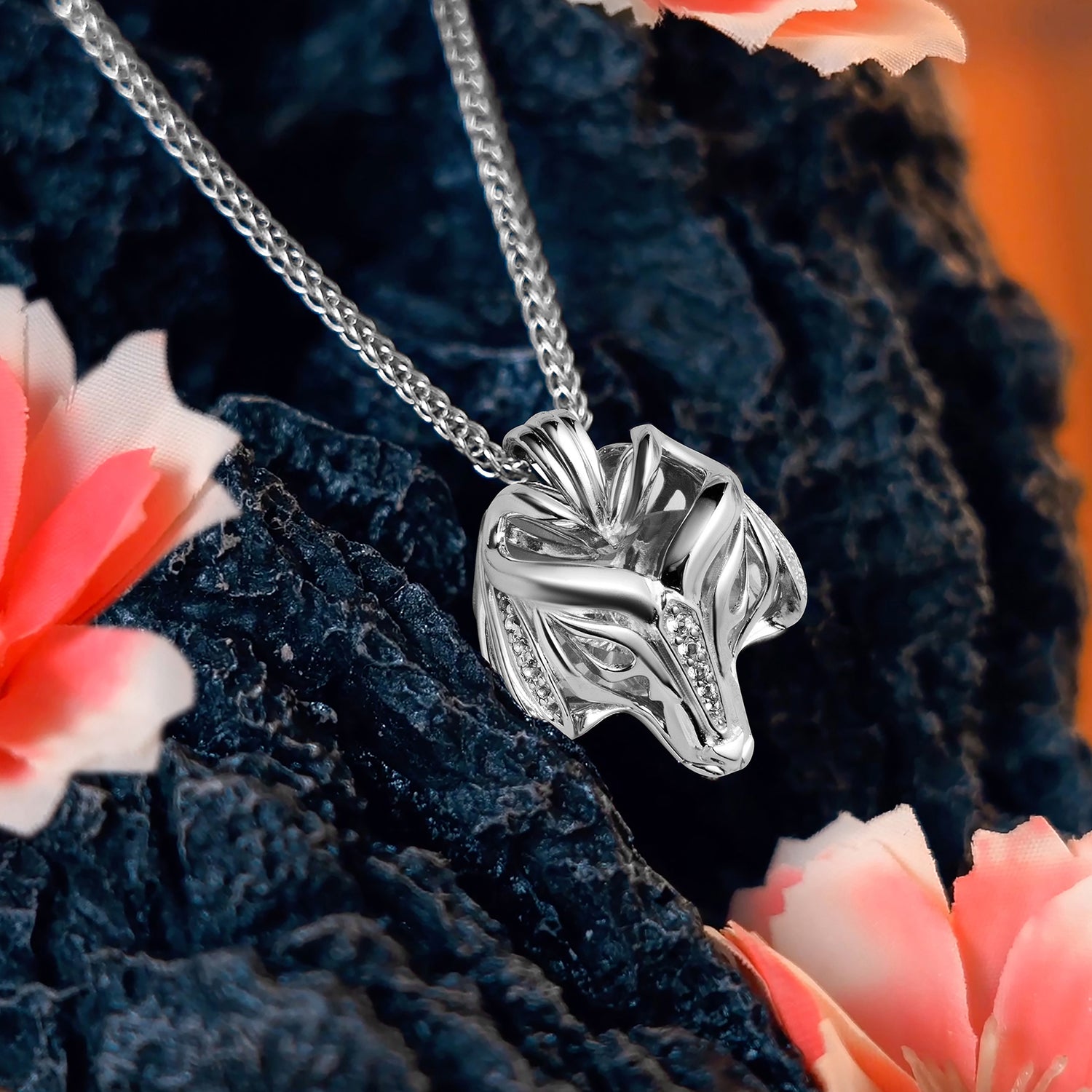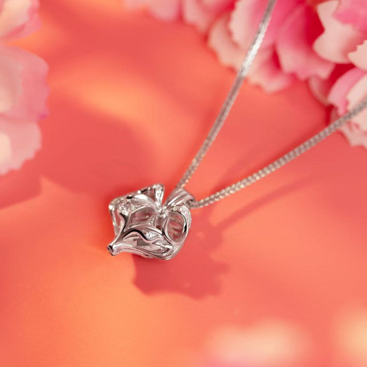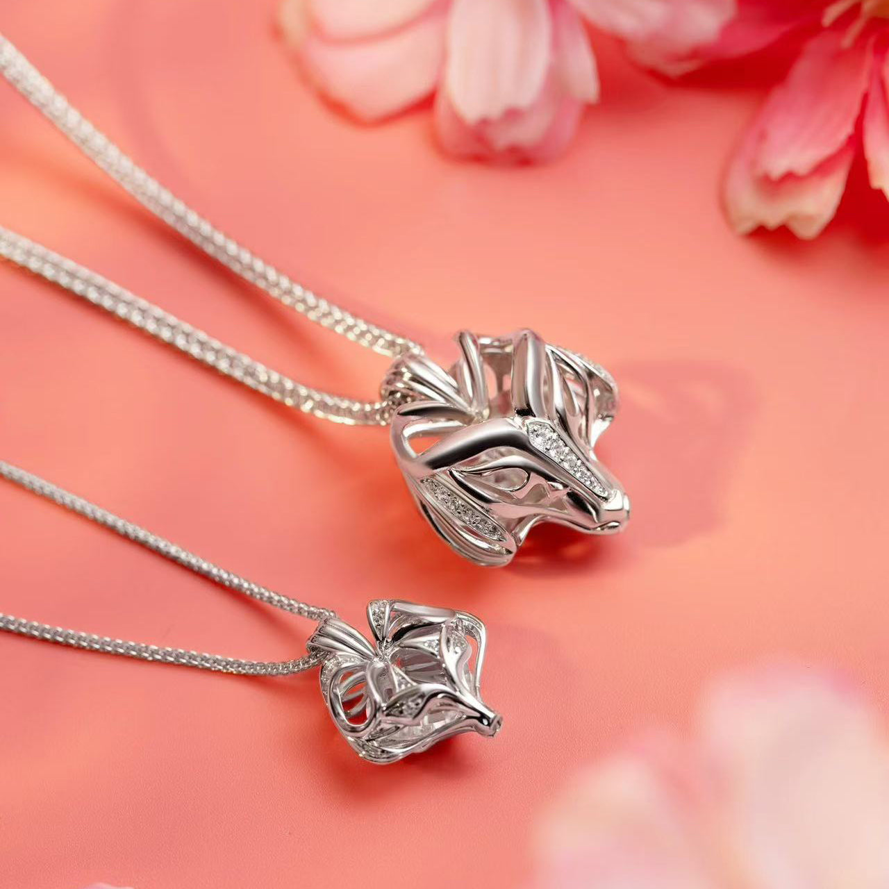 Der Anhänger zeigt einen dreidimensional gestalteten, hohlen Fuchskopf, verziert mit feinen Edelsteindetails – Ausdruck von Klugheit, Anmut und Schutz. Auf der Rückseite sind die Zeichen „Xian Hu“ (Fuchsgeist) und „Mei“ (Anziehung) eingraviert, die romantische Energie und Beliebtheit verstärken.